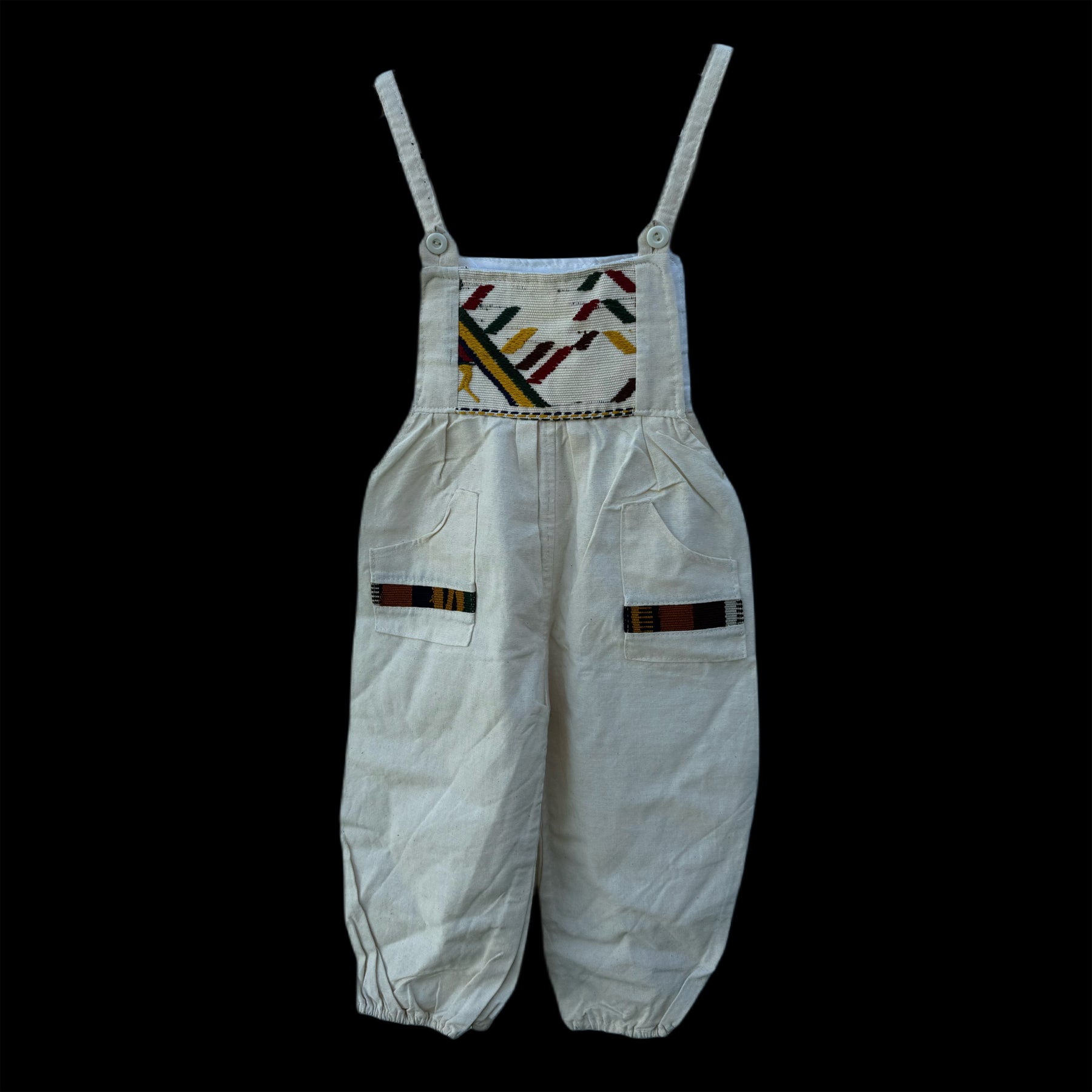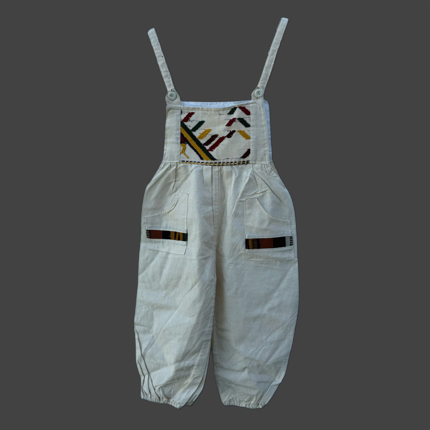This children’s dress was handmade in Guatemala, featuring panels of woven huipil. A huipil is a traditional garment with origins across Mesoamerica. The huipil (from Nahuatl huīpīlli) has been worn for centuries by indigenous women in both Mexico and Central America, with each community creating its own regional styles, colors, and motifs.