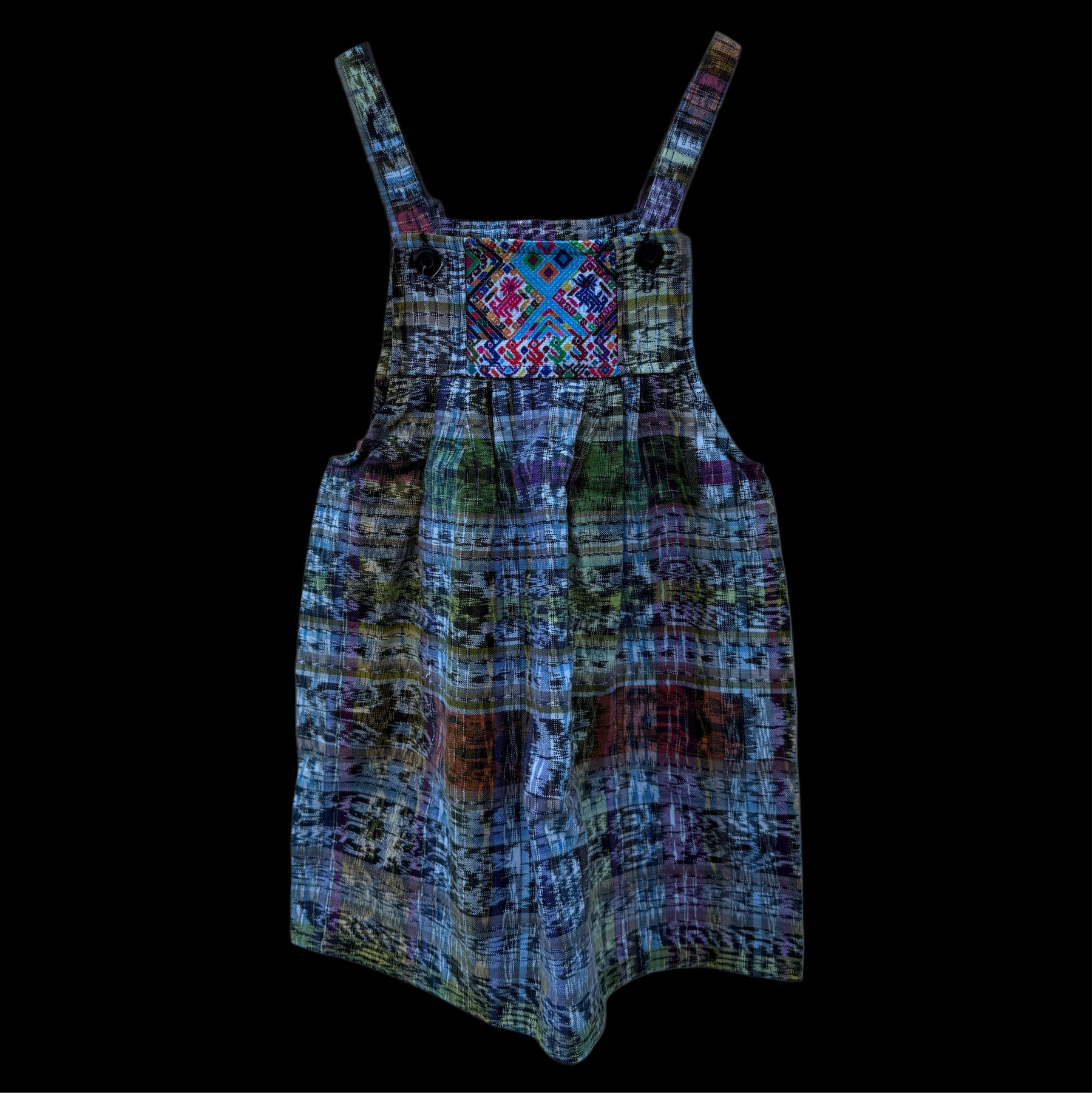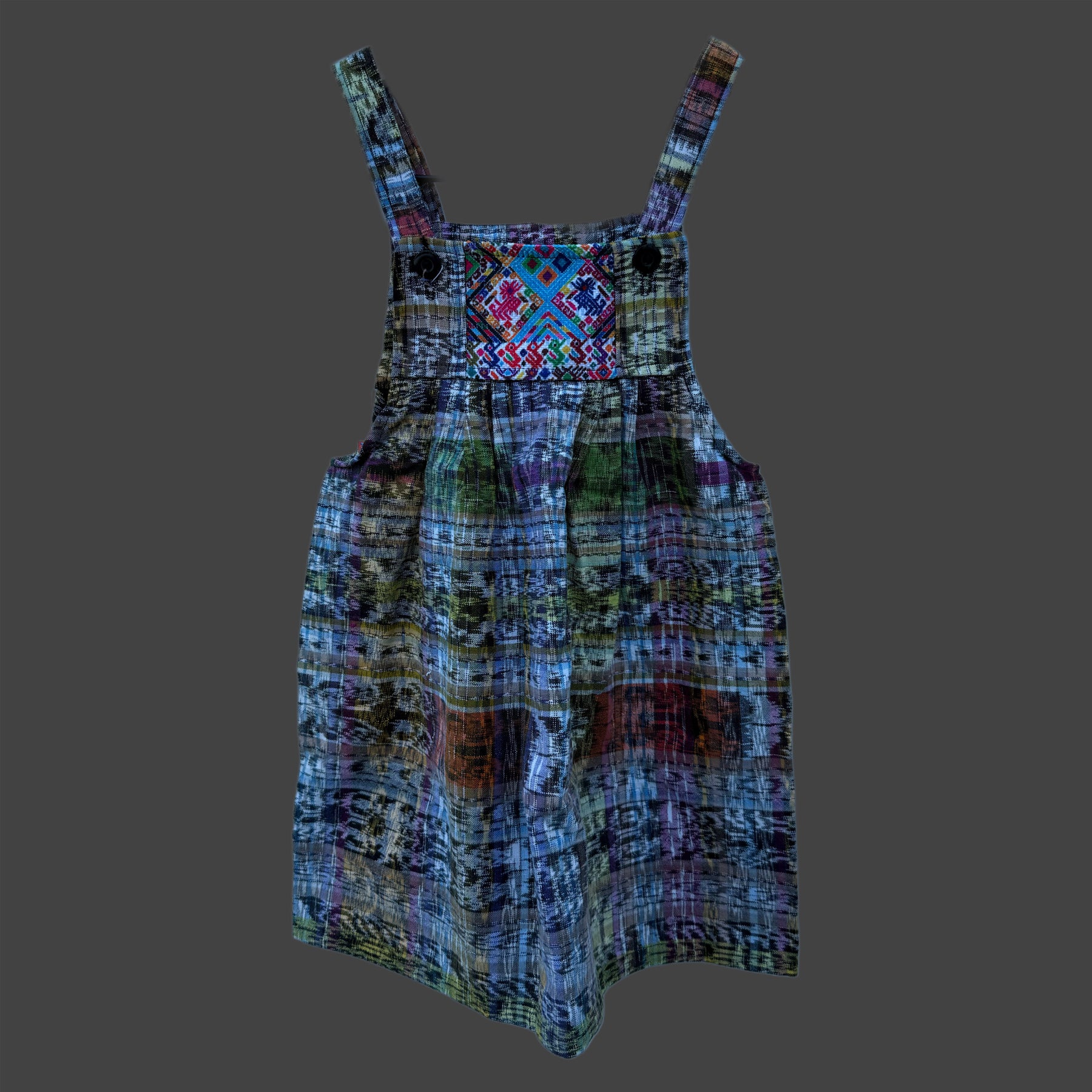 This children’s dress was handmade in Guatemala, featuring panels of woven huipil. A huipil is a traditional garment with origins across Mesoamerica. The huipil (from Nahuatl huīpīlli) has been worn for centuries by indigenous women in both Mexico and Central America, with each community creating its own regional styles, colors, and motifs.