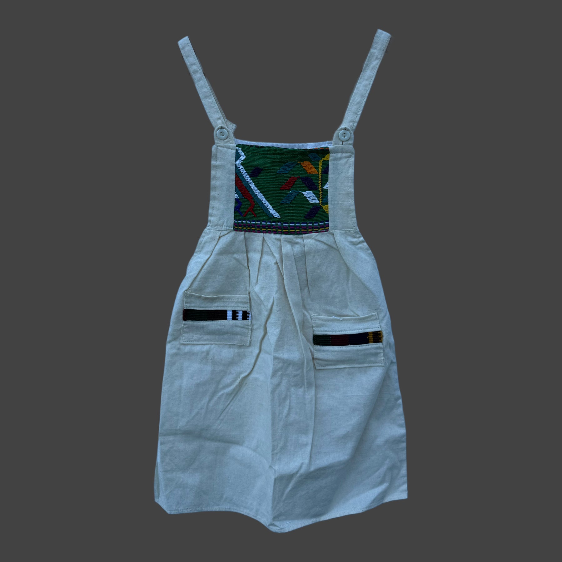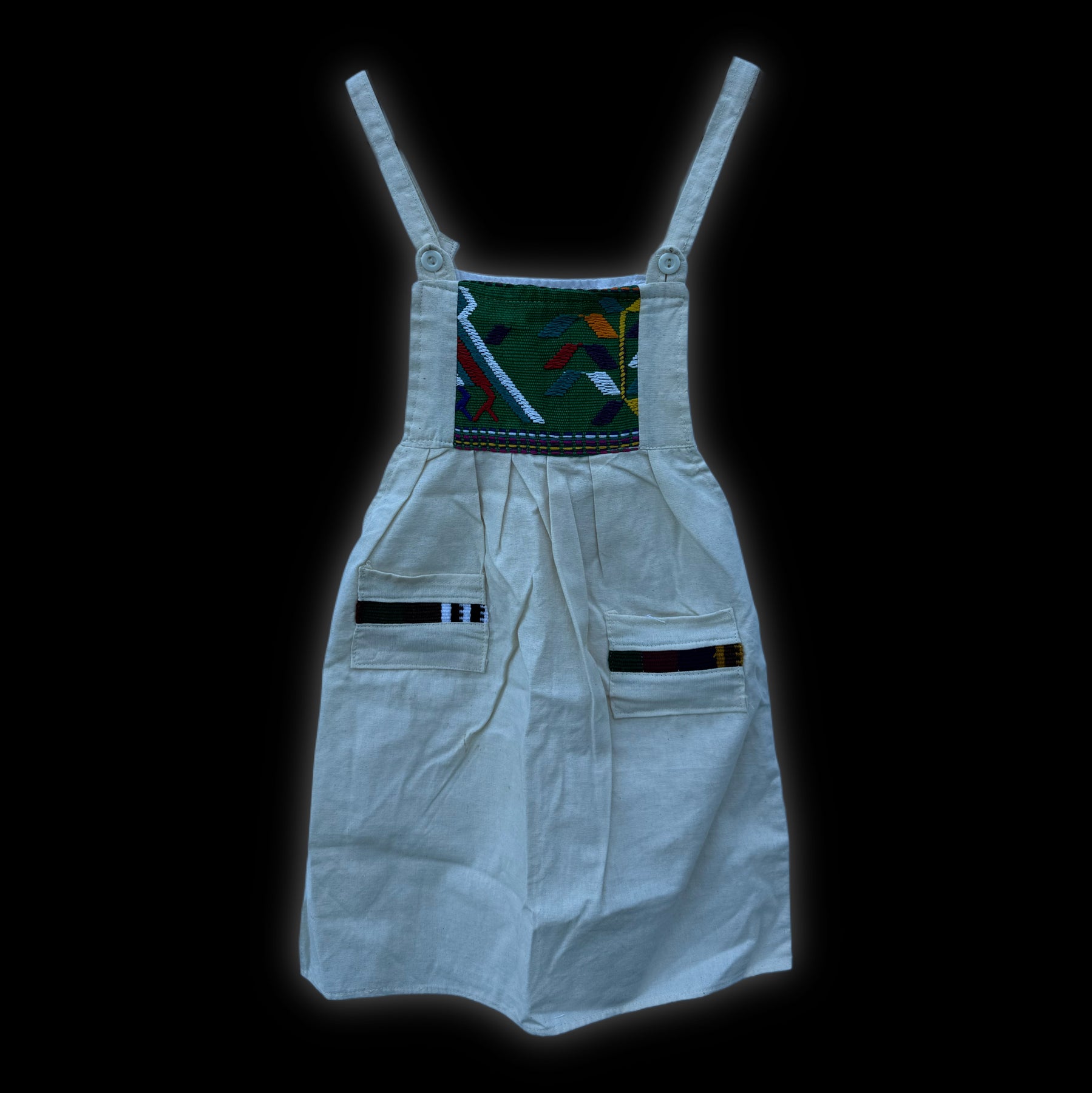 This children’s dress was handmade in Guatemala, featuring panels of woven huipil. A huipil is a traditional garment with origins across Mesoamerica. The huipil (from Nahuatl huīpīlli) has been worn for centuries by indigenous women in both Mexico and Central America, with each community creating its own regional styles, colors, and motifs.